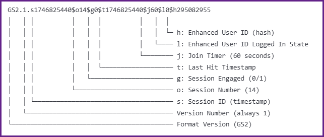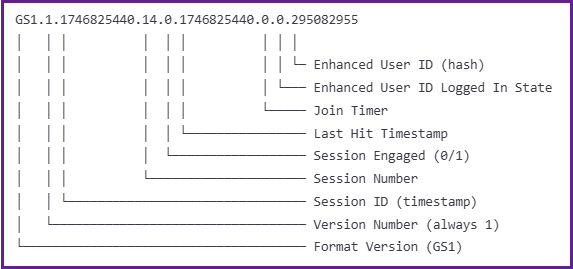 s- Session IDo- Session Numberg- Session Engagedt- Last Hit Timestampj- Join Timerl- Enhanced User ID Logged In Stateh- Enhanced User ID (hash)d- Join ID (not present in this example, appears in some cookies)