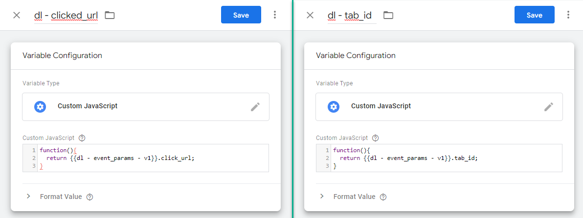 }):Then in Google Tag Manager we'd be defining two variables. let's name them {{dl - clicked_url}} and {{dl - tab_id}} . Let's see how they would look depending on how we read them