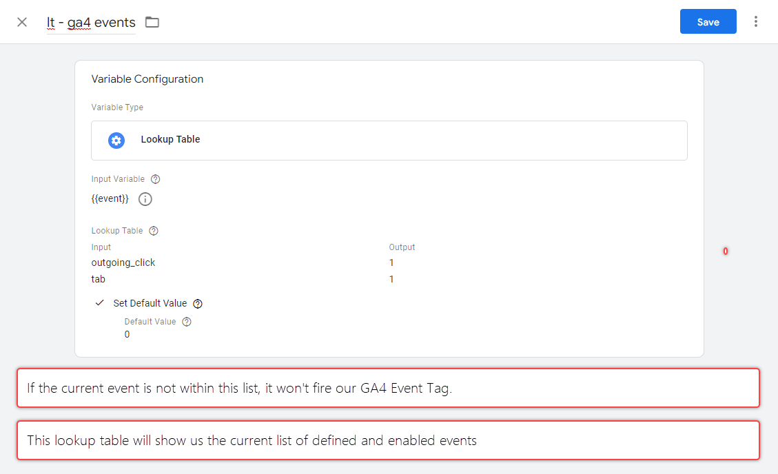 Create a lookup table type variable in Google Tag Manager, on this table we'll define an output of 1 for all the events name we want to enable ( ie: that will fire our GA4 event tag ), and then a default value of 0