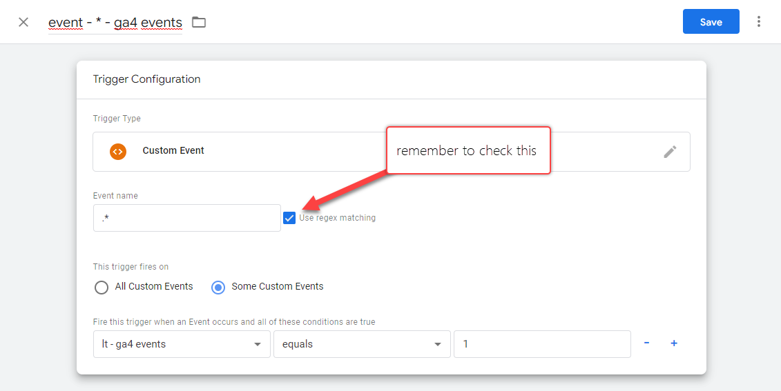 That's where our trigger comes into scene, we'll define a firing trigger that will trigger on .* the events, but only if the current event name is within an events lookup table.