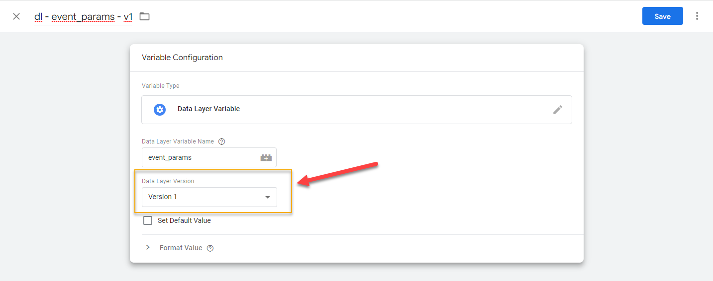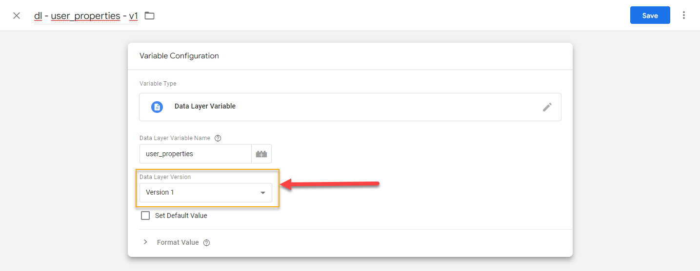 This may be a bit confusing for some people, but as we explained before the need to use a version 1 parameter, but we also mentioned this dataLayer variable type does not support nested values. The workaround for this is using a variable that grabs the main key ( user_properties, event_params ) and then having some Custom JS variables returning the values we need.