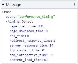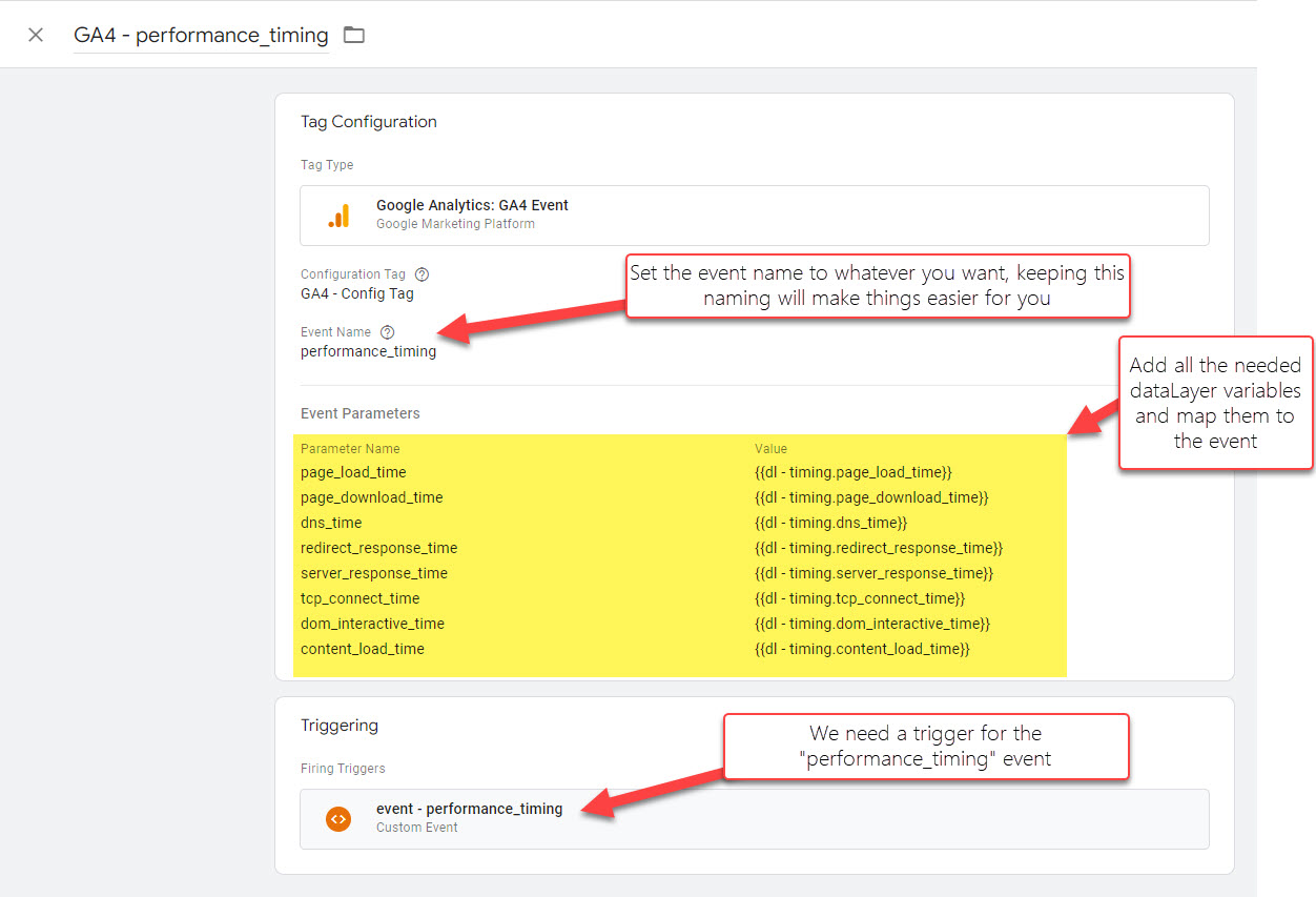 The code we added above will kindly push all the performance timing data in a nicely formated dataLayer push, that we later use to pass the data to any tag/vendor we want. In our case we'll pushing the data to a GA4 event tag.