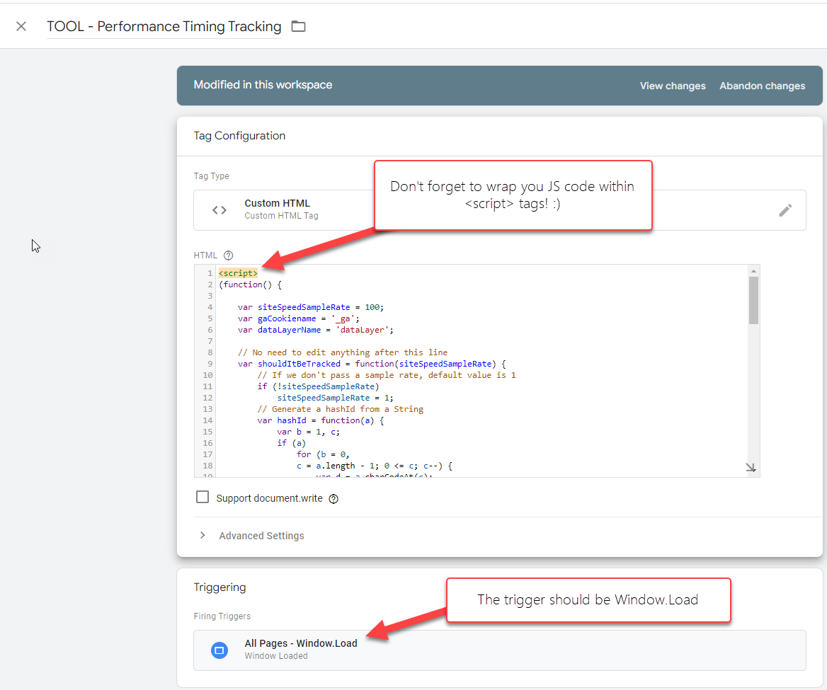 The first thing we need to do it adding the following code snippet above in a Custom HTML tag in Google Tag Manager, that fired on the Window Load event.