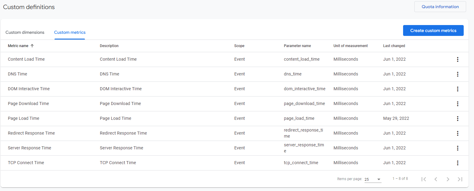 For this we need to go to the Custom Definitions > Custom Metrics, and add all this new parameters with the event scope and Milliseconds as the Unit of Measurement.