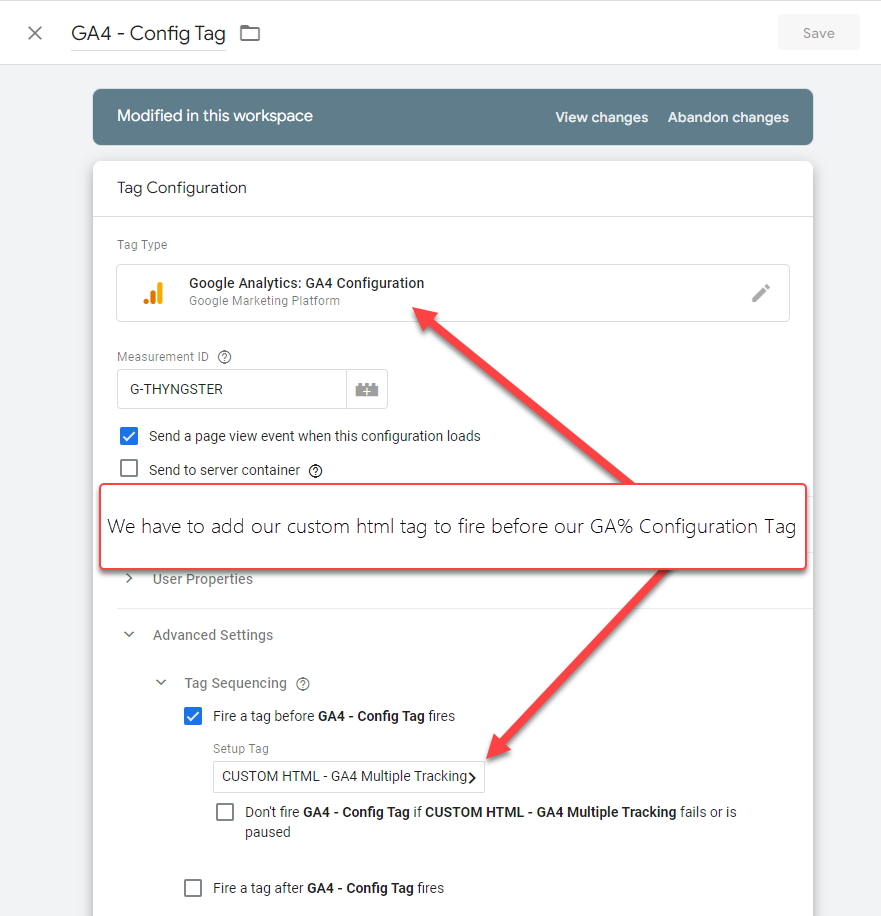 There's one thing we need to have in mind and is that this code MUST be run before Google Analytics 4 Config Tag, and for achieving this we'll use the Tag Sequencing on Google Tag Manager.