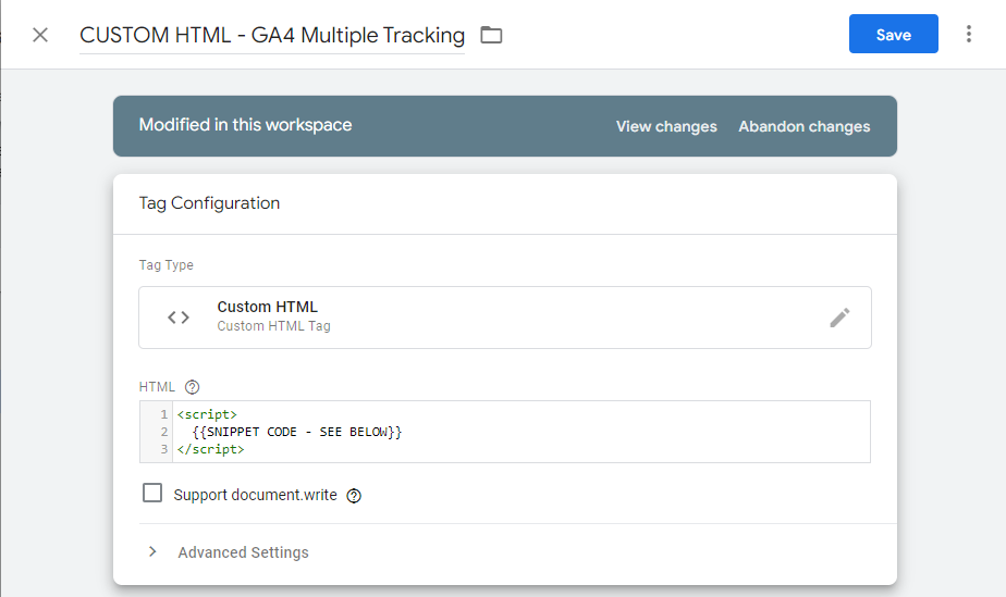 This snippet code is pretty straightforward, there's only one thing we need to configure, and it's the first variable with the Measurement IDs to where we want to send the data.
