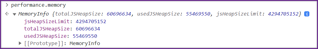 The point of this post is measuring the current memory usage by the JavaScript in our pages, for this we'll be using the performance.memory API . I have to start saying it's a currently deprecated feature that it's only available on Chromium browsers, which returns the JavaScript heap details, and that it may miss some accuracy depending on if some pages sahre the same heap or the page has iframes using a separate heaps.