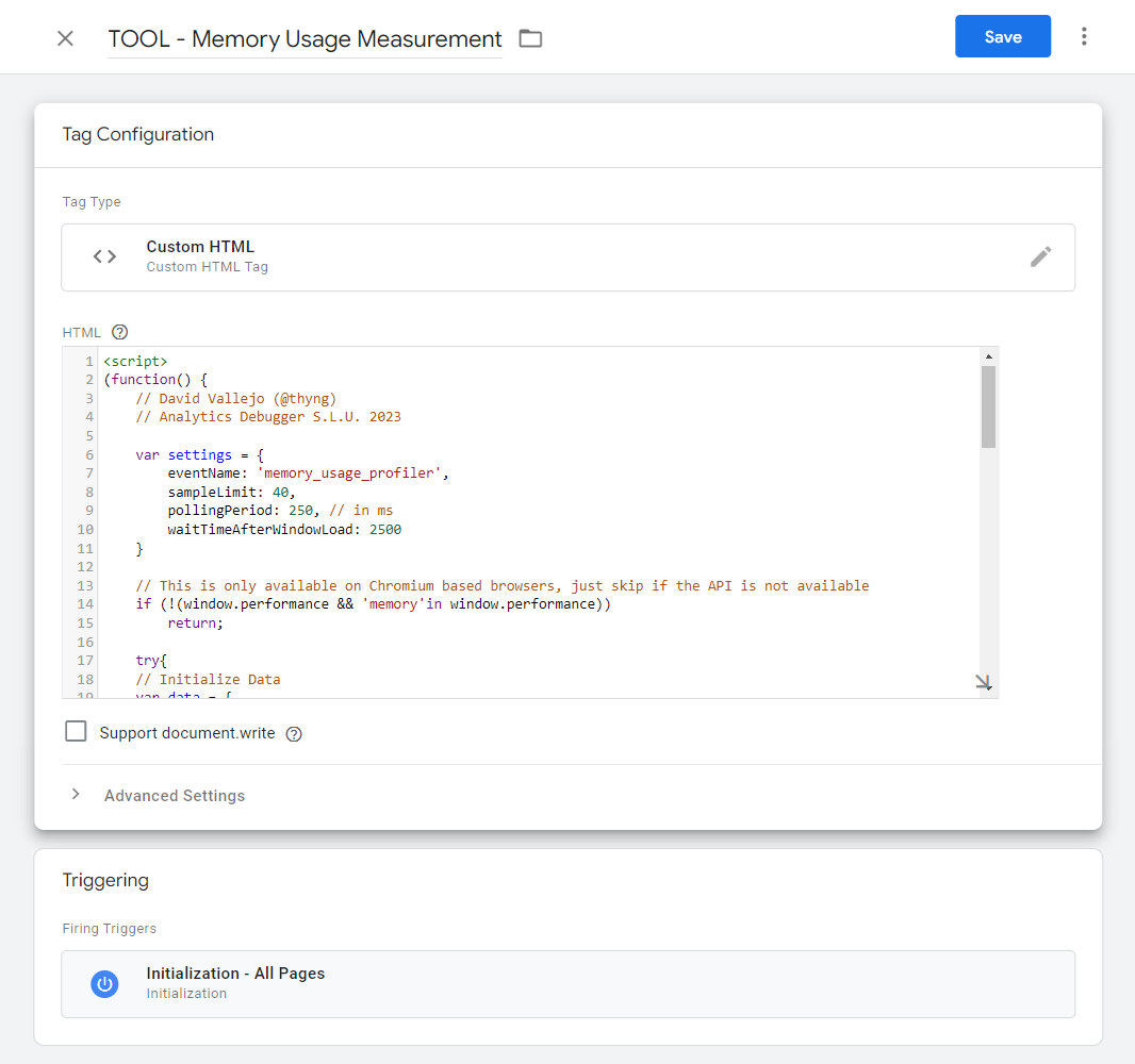 In any case returning the current memory usage at an specific moment doesn't give much value, so I prepared an script that will recording the current values during the page load, and that pushes the maximum, minumun, and average memory usage to our dataLayer.