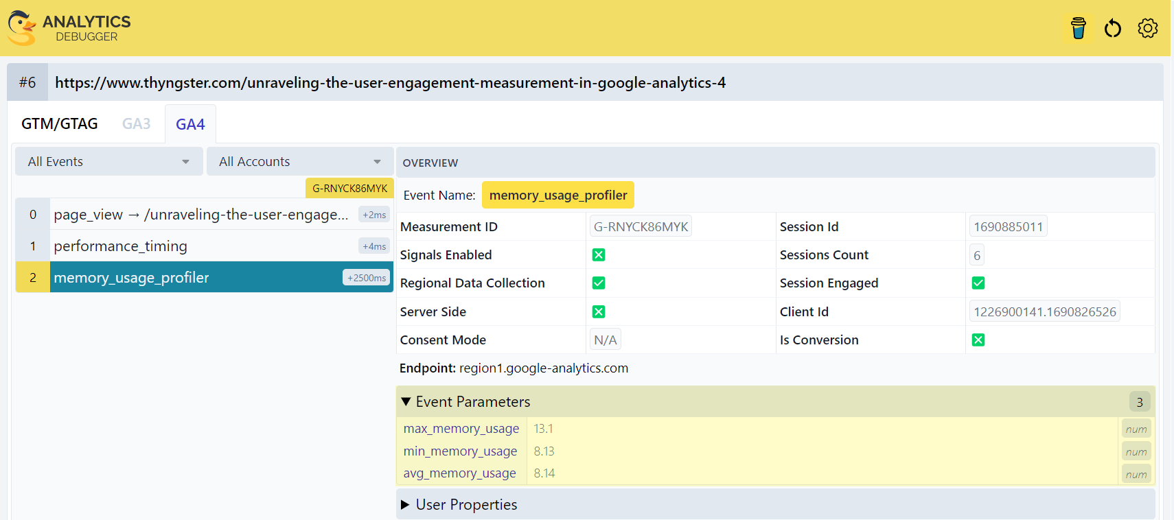 It's gonna be some easy setup, just create 3 dataLayer type variables, a trigger to match the event name you defined for this tracking ( default: "memory_usage_profiler" ) , and lastly map all to a GA4 event Tag.