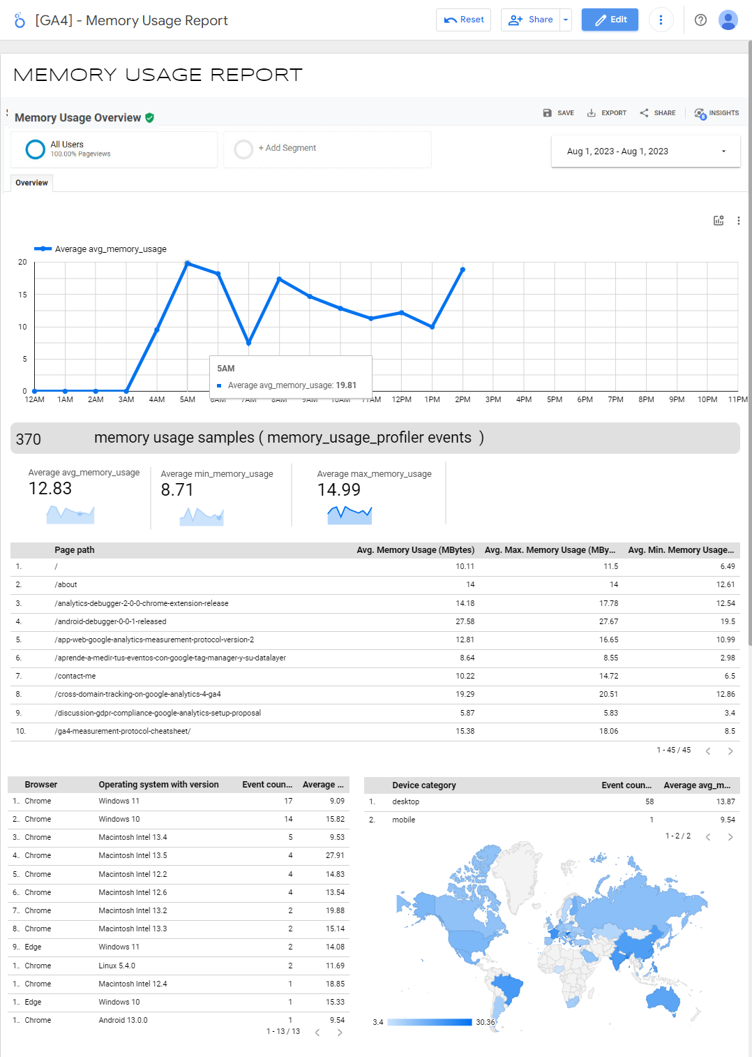 Here you can find the code that will take care of monitoring the memory usage over the page load. Please the sooner you add this code into the page the better, if you are using Google Tag Manager using the gtm.init , gtm.js / All Pages events, if you have a TMS with the option of adding sychrounous code that's your best choice, and lastly adding directly into the page.