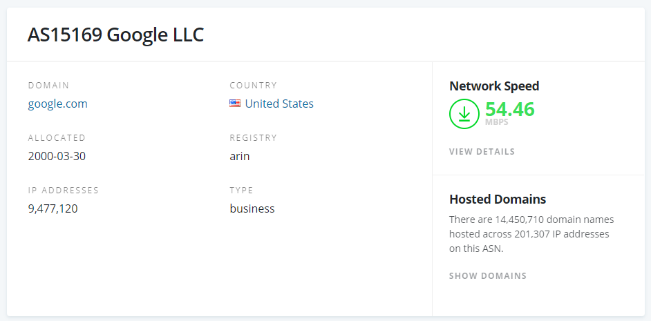 Each ISP usually have their own ( they can have more than 1 ) . ASN. For example one of main ASN in Google is: AS15169 registered to Google LLC, and this Autonomous System manages 9.5 millions IPs from Google: